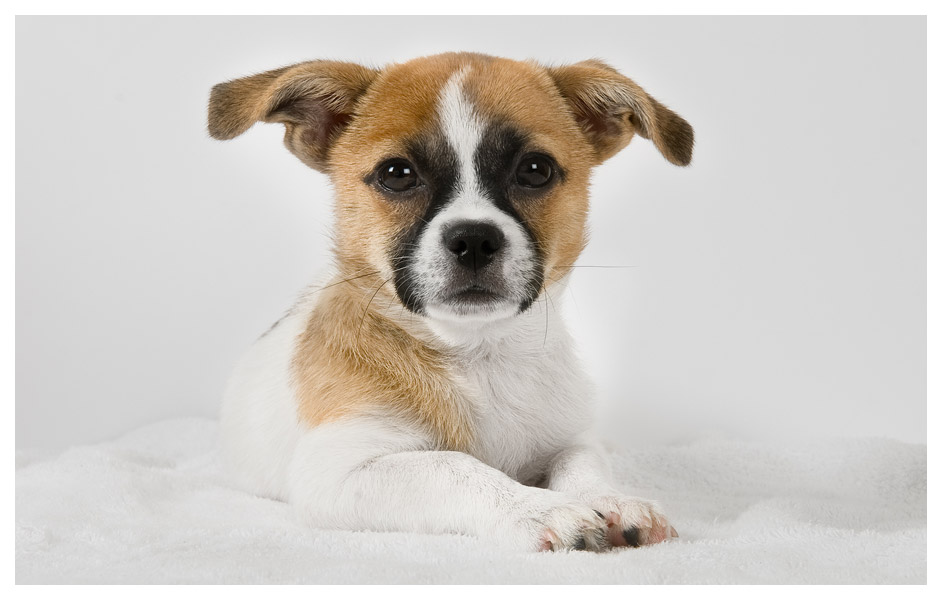 Här har han hunnit bli tre månader, och ligger och poserar lite stylish på fluffig frotté. Den här bilden var senare med i Härliga Hund, matte och husse var så klart jättestolta och köpte X antal lösnummer.