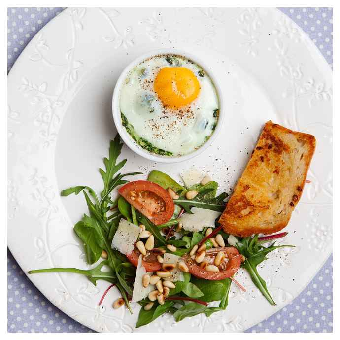Hacka schalottenlöken och vitlöken och fräs hacket i lite smör eller olivolja. Låt sedan spenaten fräsa med någon minut, och krydda med salt, peppar och muskot. Läg upp i smorda, ugnsfasta små formar, och avsluta med att knäcka ett ägg över varje form. Gratinera i mitten av ugnen i ca 15-20 min på 175C, tills ägget stannar och inte längre är rinnigt. Som sagt – har du bacon hemma, prova gärna att knapersteka ett paket och fördela i formarna, och varför inte röra ner någon matsked crème fraiche också? Det ska jag prova nästa gång! Servera med en god sallad och en skiva vitlöksbröd.