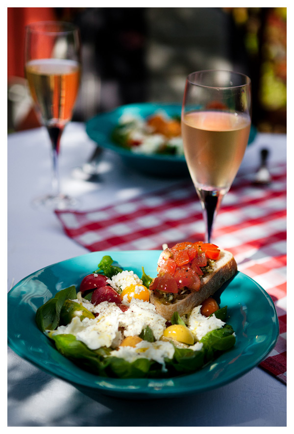 När vi kom hem därifrån lagade Olof en underbar lunch som var tänkt att vara ett återskapande av den goda lunchen vi åt på vår bröllopsresa i Toscana, den där dagen då det regnade så mycket och vi fick stanna inne. Precis som då bestod lunchen av spaghetti, basilika, tomater och buffelmozzarella, med en bruschetta vid sidan av. Till det drack vi – precis som då – vitt vin. Kontinentalt och trevligt med vin till lunchen, det är inte varje dag.