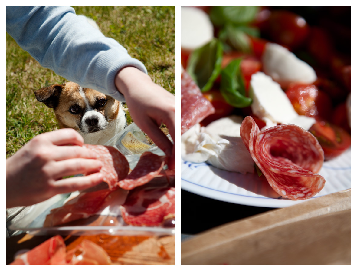 En medhavd matsäck blir inte roligare än man gör den, och varför då inte göra den extra rolig? På väg ut till stugan stannade vi till vid mataffären och köpte med oss lite körsbärstomater, basilika, mozzarella, blandade italienska charkuterier och en baguette.