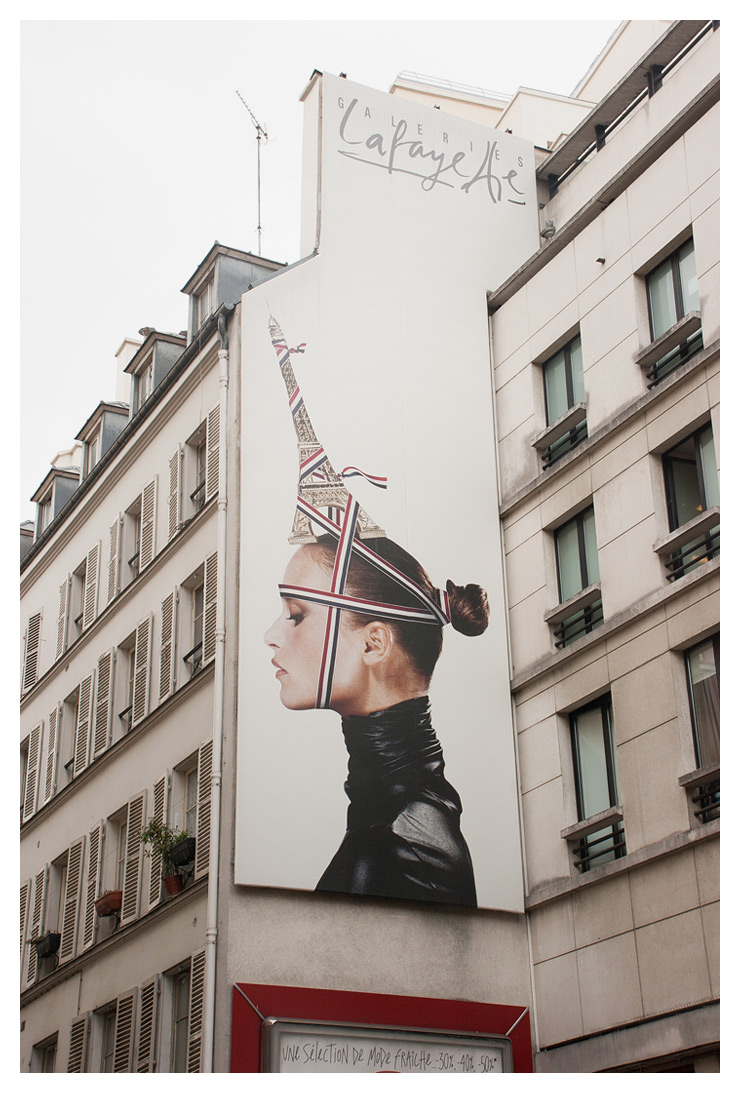 …och Lafayette. Stackars tjej alltså, hon har fått ett eiffeltorn på huvudet. Jag undrar hur hon beskrev sitt modelluppdrag för sina vänner? ”Jo, det är ett gig för Lafayette! Det ska bli roligt! Jag ska ha ett eiffeltorn på huvudet och en polotröja i latex. Och lite franska snören. Och så ska jag se lite svårmodig ut”.