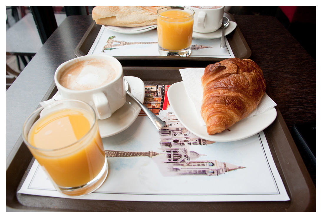 Varje morgon åt vi croissant till frukost och drack café au lait på ett av fiken i Montmartre där hotellet låg.
