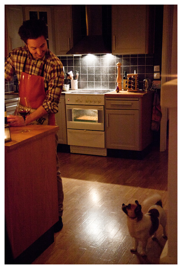 …medan Lille Herrn står nedanför och vill smaka. Han kan tänka sig i stort sett vad som helst. Utom möjligtvis vin. Det sitter för övrigt matte och smuttar på just nu, medan hon bloggar. Men nu verkar maten vara färdig, bäst att skynda sig! Trevlig fredagkväll, allihopa!