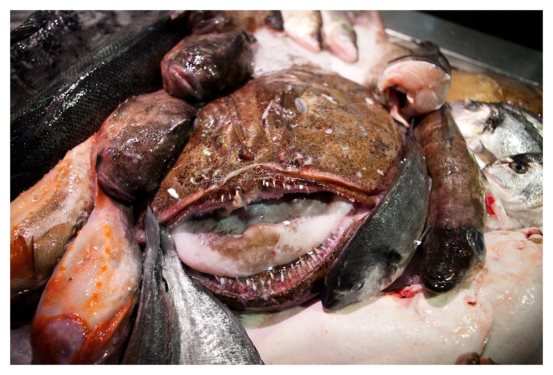 I förrgår när vi strosade runt på stan i Göteborg gjorde vi ett givet stopp på Feskekörkan. Olof hade aldrig varit där, chockerande nog. Stället var fullt av fula fiskar, precis som på Stureplan i Stockholm. Den här fisken ser ut att gapa efter mycket. Vilka tänder! Vilken tunga! Hu!