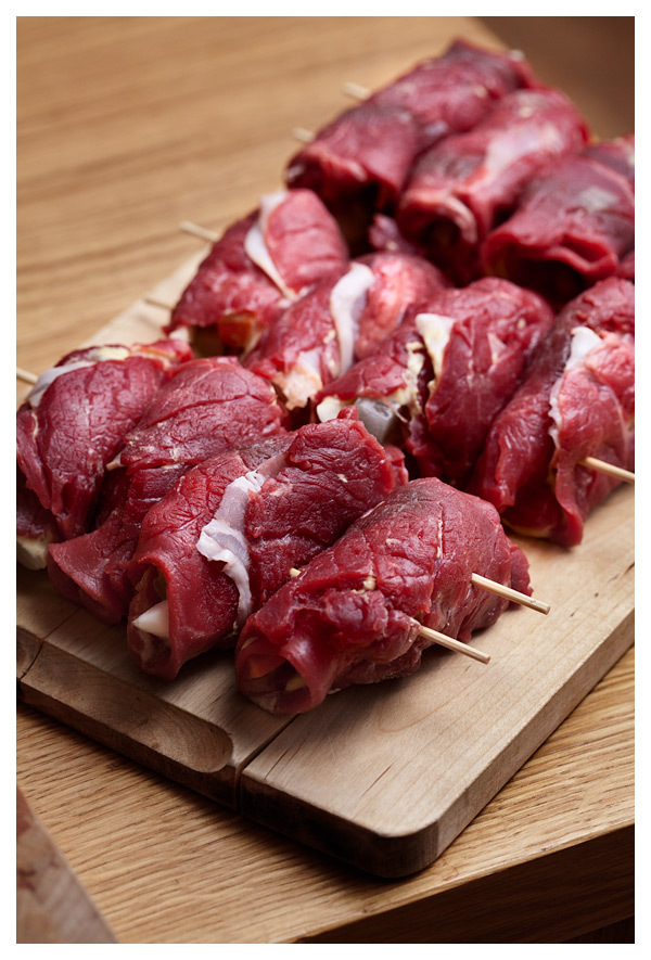 En favoriträtt på helgerna här hemma är lyxiga rullader. Olof brukar stå för dem, eftersom det är ett recept han finner manligt och som gör att han kan känna sig lite som Per Morberg när han tillagar det. Olof går in för sina rullader till 110%, och ser uppriktigt sårad ut när jag påminner honom om att vi har en köttbank avsedd just för att platta till köttbitar med, när han står med stekpannan i en höjd backhandsving. Rulladerna tar en stund att göra, men det är en perfekt maträtt en söndag, eller när man har gäster. Receptet är beräknat för 4 personer: