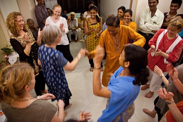 På en indisk släktfest sitter man knappast vid ett långbord och småpratar, utan alla dansar och står i för fulla muggar. Indierna sjöng rituella sånger under Haldi-ceremonin som alla verkade kunna, och de frågade oss ifall vi i vår kultur inte hade några speciella ceremoniella sånger som vi ville sjunga. Vi tänkte efter en stund, sen körde vi ”Små grodorna”.