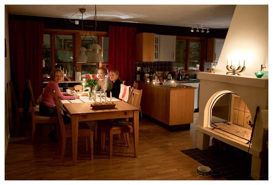 Varje julmarknad avslutas alltid med obligatorisk kvällsfika hemma hos oss, där vi provsmakar korvar, marmelader och bröd som vi köpt. Bally tog fram sina små hundögon och lurade av husse en hel del korv. På bilden syns syrran, jag och svärmor Désirée, alla väldigt mätta och nöjda.
