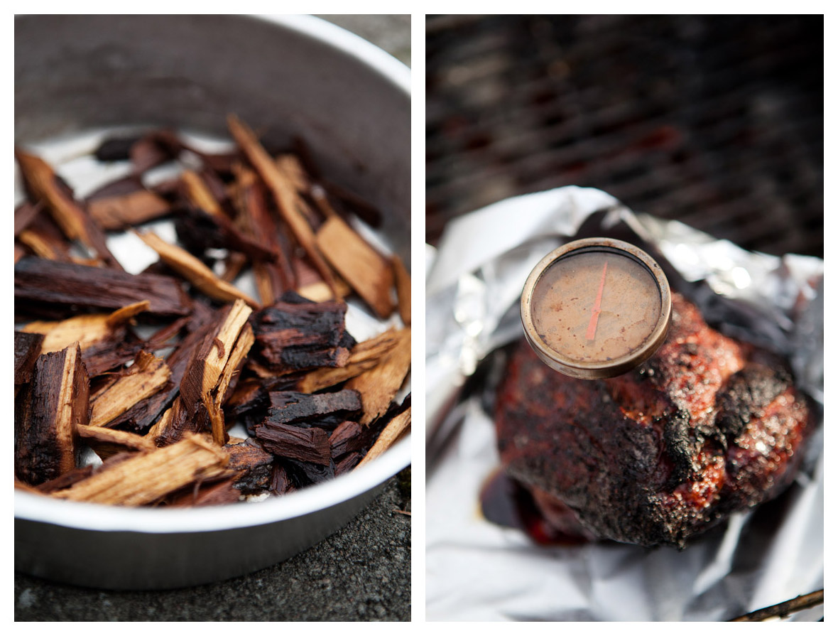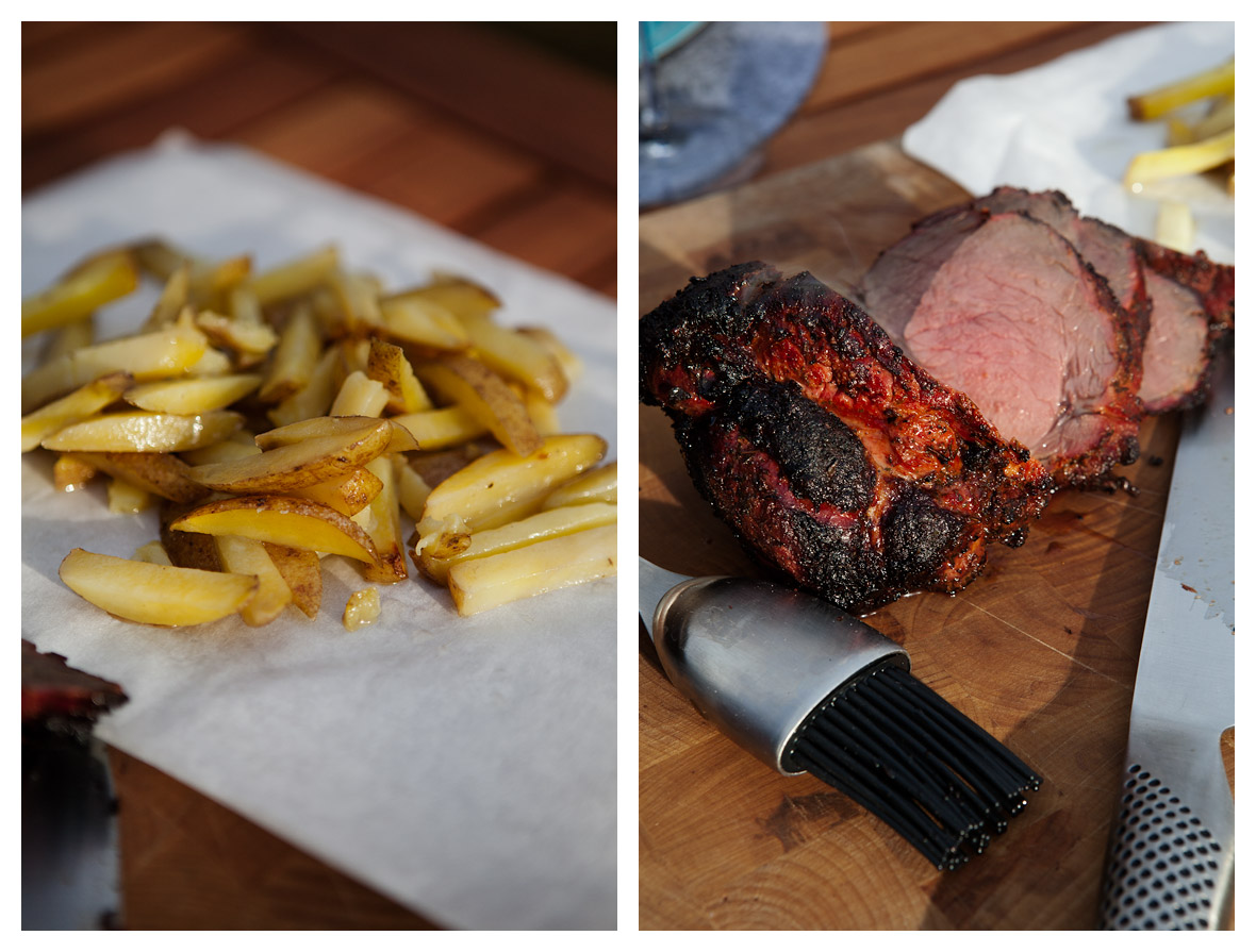 Både lammsteken och pommesen lades på grillen samtidigt, och det tog ca 1 timme innan det var klart. Allting grillades under lock, och bara halva grillen var fylld med kol, på ena sidan. På den sidan det inte låg kol grillades såväl lamm som pommes. Som synes har vår grilltermometer sett sina bästa dagar, men vi siktade på att ta av köttet från grillen och vira in det i folie och låta det vila däri i ca 15 min när det uppnått en innertemperatur på ca 60 grader. Det missade vi så klart, så det fick några grader till på sig, men var lika gott ändå.