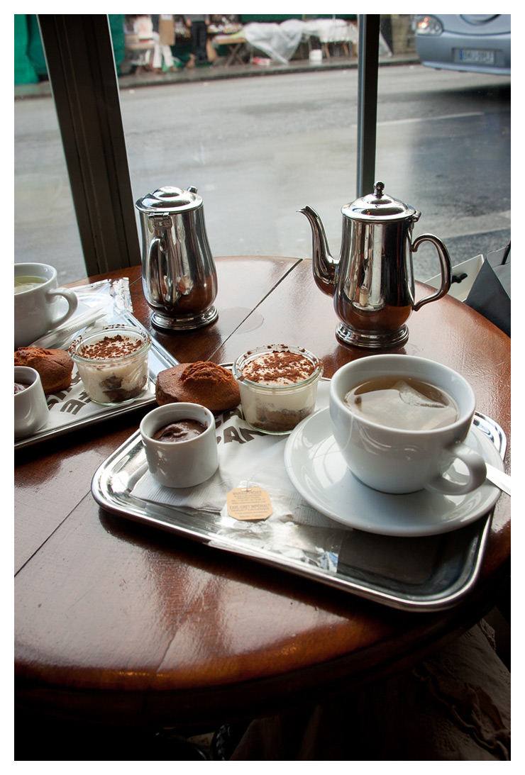 När det började regna hade vi turen att få ett ledigt fönsterbord på ett café precis vid floden. De hade något så trevligt som en fikameny. Vi valde alternativet där man fick lyxigt té tillsammans med tre små miniatyrdesserter; chokladmousse, tiramisú och mandelkaka.