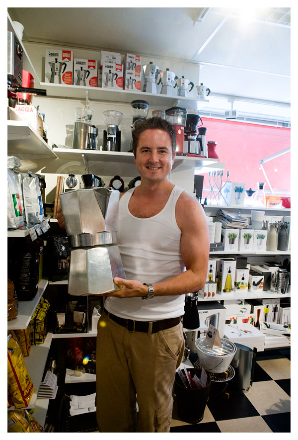 Olof visar glatt upp en espressokanna som han tycker är av lämplig storlek i förhållande till hans kaffeintag.