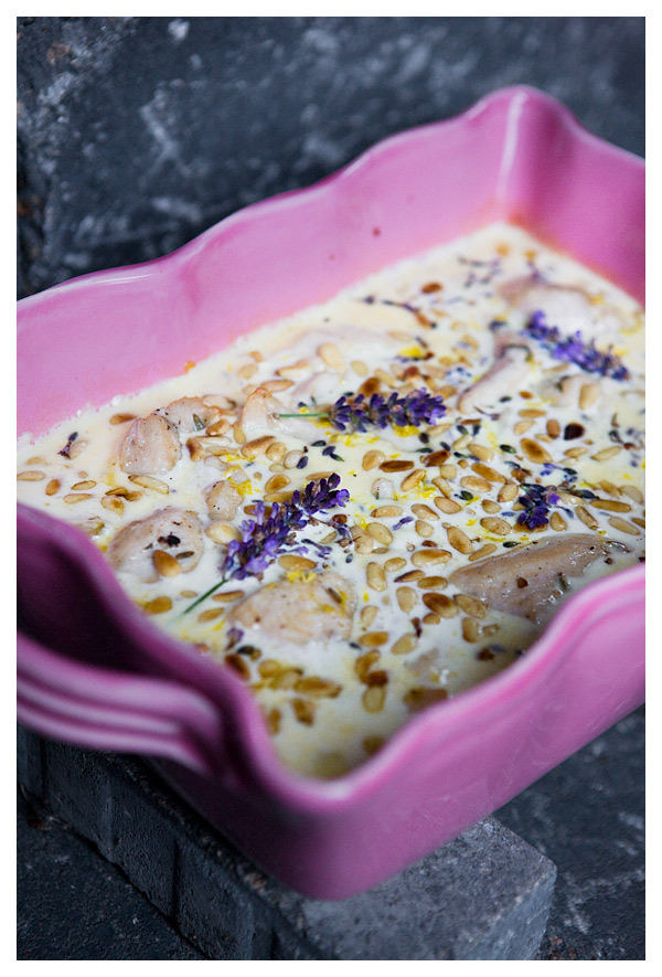 Skär kycklingfiléerna i ganska stora bitar, salta och peppra dem och bryn dem i smör i en stekpanna. Lägg dem sedan i en smord ugnsform. Vispa ihop grädde med pressade vitlöksklyftor, kycklingfond, lavendel, citronsaft och lite extra salt och peppar. Häll det över kycklingen, och ställ in i ugnen på 200 C i ca 15 minuter, tills kycklingen är färdig helt igenom. Strö över rivet citronskal och rostade pinjenötter, och garnera gärna med ett par extra lavendelblommor. Servera med färsk potatis.
