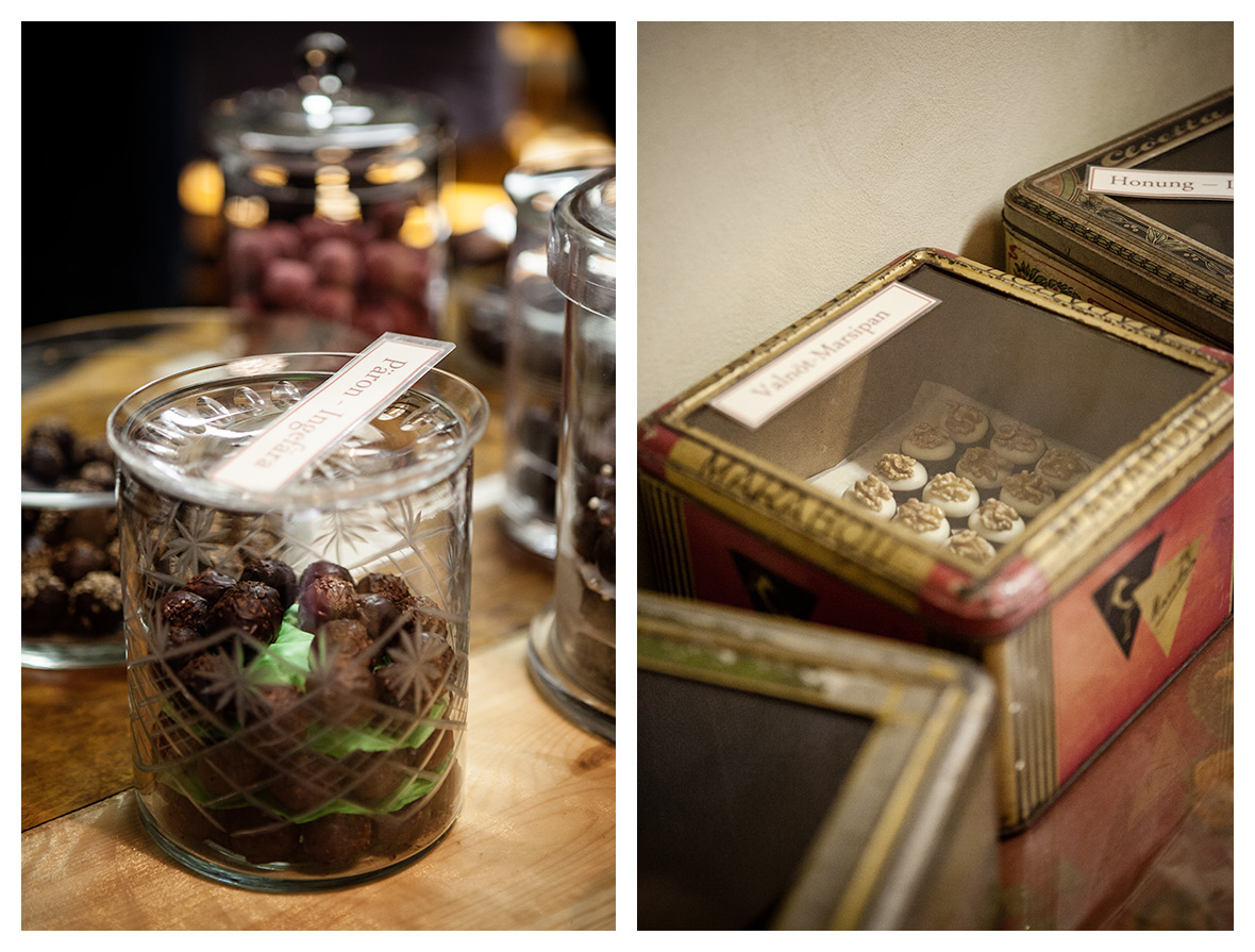 Smakkombinationerna var riktigt oväntade, en pralin smakade körsbär och balsamico, och en annan smakade svensk barrskog och italiensk lakrits. Vilken uppfinningsrikedom! Tänk att råka bli inlåst av misstag i en sådan här chokladbutik, det vore ju underbart. Mycket bättre än att bli inlåst på till exempel …tja…Bauhaus.