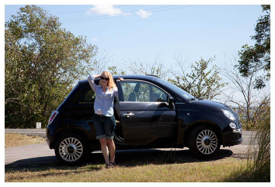 Hyrbil är ett måste i Toscana, för att ta sig mellan byarna. Här poserar jag framför vår lilla Fiat 500 som vi hyrde. En Fiat 500 hör helt enkelt till när man är i Italien. Men den var inte så motorstark, i uppförsbackarna fick man ligga och köra på ettan. Eller Olof fick köra på ettan. Jag drack vin. Inte i bilen, men till måltiderna. Han åt ändå lite medicin eftersom han drog igång lite hederligt bröllopsdrama och drog ut en tand dagen innan bröllopet. Jag trodde jag skulle få den som morgongåva, men jag fick ett halsband istället.