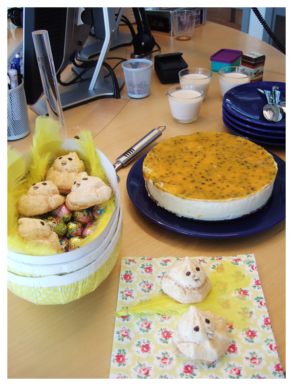 Dessutom hade hon med sig den här påskgula frusna cheesecaken, som hade en chokladbotten, citronsmakande fyllning och ett täcke av mango och passionsfrukt. Den var så god att jag ska svänga ihop mig ett eget exemplar snarast, kanske redan i helgen!