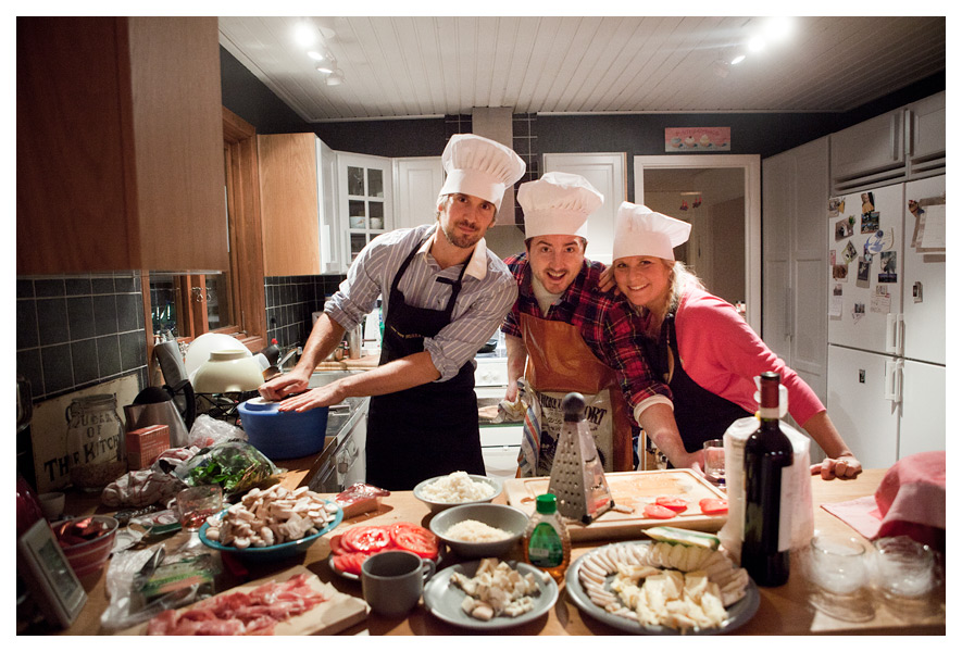 För några dagar sedan kom Calle och Louise över till oss med en kasse sydeuropeiska delikatesser i form av ostar, vin och charkuterier av bättre rang, och vi tog pizzabakning till en helt ny dimension. Calle och Louise hade skaffat kockmössor till oss alla fyra, för att vi skulle se riktigt trovärdiga ut.