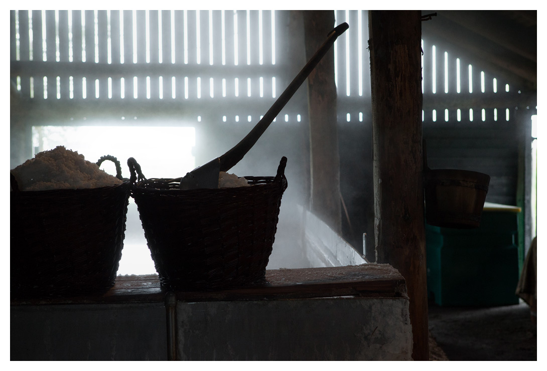 Bild tagen inne i ”produktionen”. I de stora korgarna får saltet sedan torka.