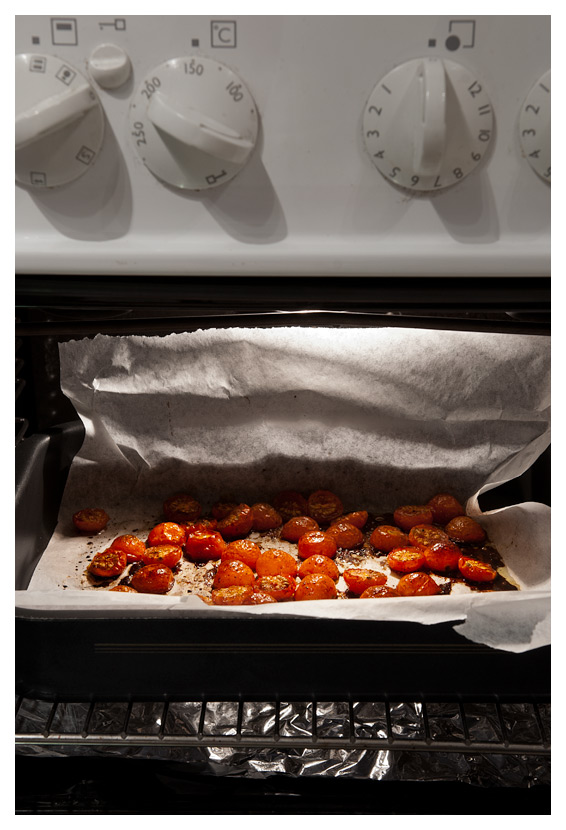 Ja. Det här ser ju inte så kul ut. Skrumpna tomater på ett förkolnat, skabbigt papper. Men här ska man inte låta sig luras av utseendet, det är minsann insidan som räknas! De ugnsrostade tomaterna är underbart söta i smaken och sätter piff på vad som helst. (Utom din vita tröja. Dessvärre.) Det här är alltså min senaste grej, att ugnsrosta tomater i tid och otid. Jag brukar köpa förpackningar med cocktailtomater i mataffären, det är heta erbjudanden på sådana ganska ofta. Sedan halverar jag dem, lägger dem i en form på ett bakplåtspapper, och ringlar över lite olivolja, flingsalt, grovmalen svartpeppar och någon tsk socker. Ibland festar jag till det med lite balsamvinäger också. Sedan är det bara att köra dem i mitten av ugnen på 150C i ca två timmar, så är de klara sen. Alldeles söta blir de, och passar lika bra i en sås som till salladen eller som ”side dish” till de flesta rätter. Testa, testa!